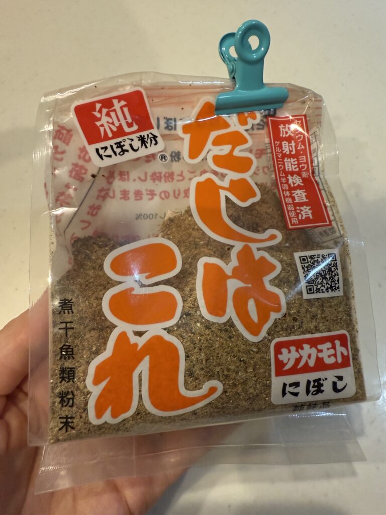 ちょっと前まで、煮干しを使っていたんですが、頭と腹を取ったりする手間を省けるかな?と思って最近は“煮干し粉”を使っています。